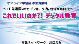 ~IT先進国スウェーデンは、タブレットをやめました~ 小中学校で、タブレットを使うデジタル教育が進められています。自宅でオンライン授業が受けられるなどメリットがある一方、子どもたちに困った影響が出ています。分からないこと … 続きを読む 「これでいいのか?!デジタル教育」オンライン学習会(7/12)