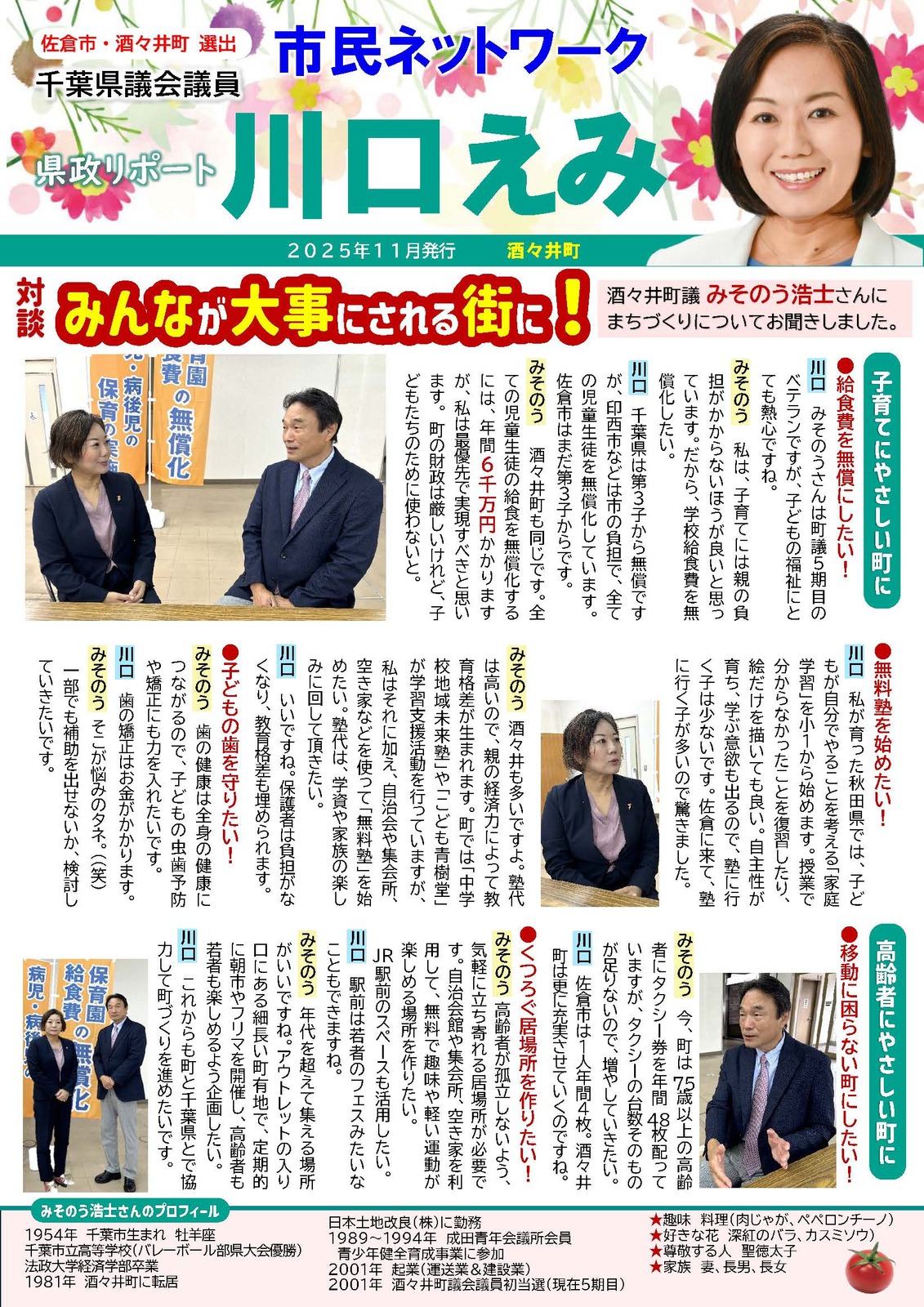 酒々井町長選(11月25日告示、11月30日投開票)に立候補予定の、みそのう浩士さん(町議5期目)を支援します。