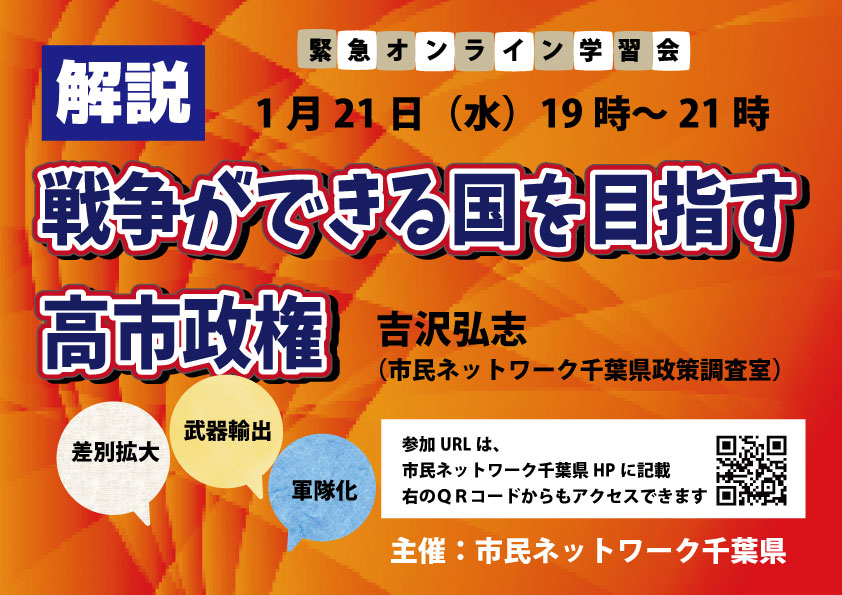 市民ネットワーク千葉県は、タイムリーな話題を学ぶオンライン学習会を開いています